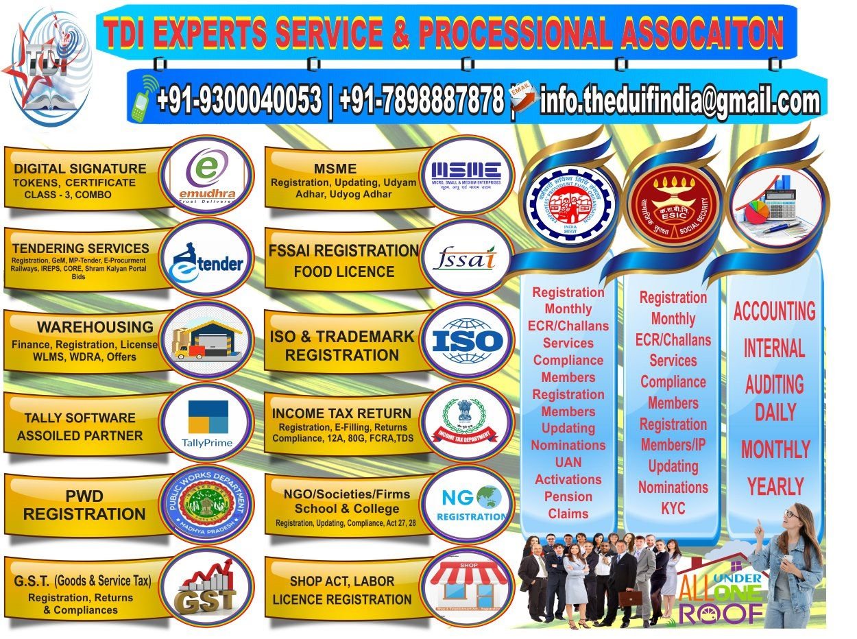 TDI Experts Service & Professional Association continues to support entrepreneurs, startups, and businesses by providing professional registration, taxation, and compliance services. The organization offers a wide range of solutions including GST registration, MSME registration, FSSAI license, digital signature certificates, income tax return filing, tender registration, ISO certification, and trademark services.